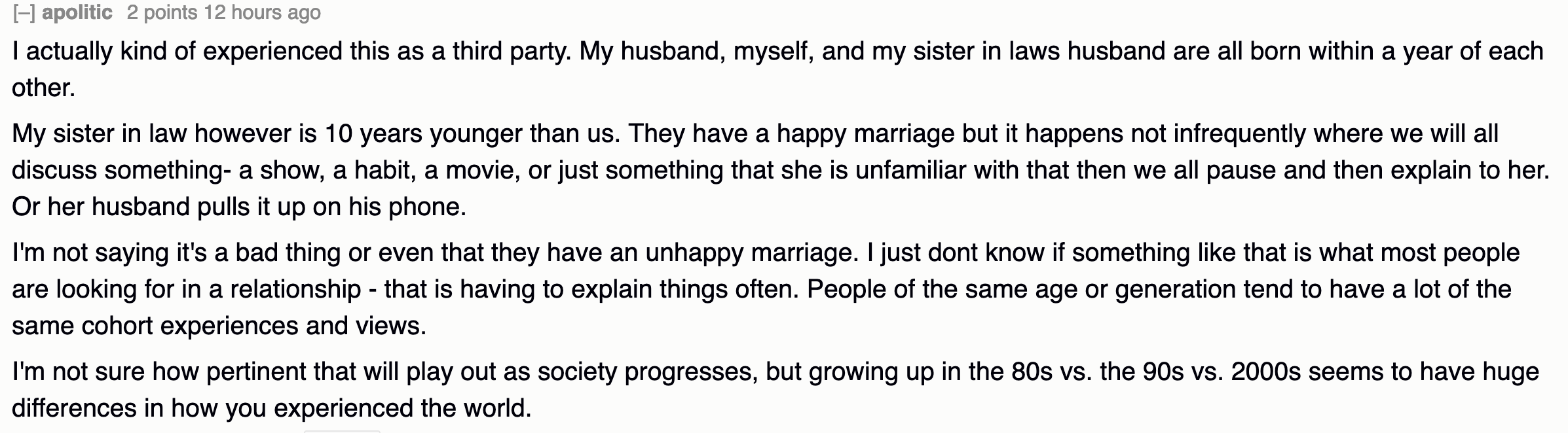 I think age gap romantic relationships are beneficial to the vast majority of people1, but even more than that I think age gap friendships are far more beneficial than the romantic variety. It saddens me to see so many people say itโs โcreepyโ that, for example, someone 38 is friends is with someone 21. That seems to be the majority view, at least in the US. Other countries donโt insist on such strict and dogmatically-enforced age segregation โ and in fact find it odd how bizarrely age-segregated the US is when they visit here.