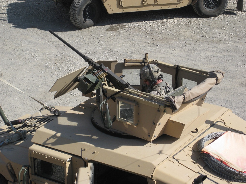 The reason for the slapping on the leg is a turret gunner stands outside of the Humvee or other vehicle, in a sort of rotating affixture with typically a .50 caliber cannon. Like this: