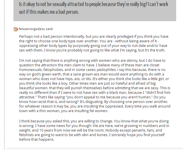 I’m sure people who don’t read as widely as I do think I’m exaggerrating when I discuss how Fat Acceptance nutjobs believe it is oppression if people aren’t attracted to them. But it’s real.