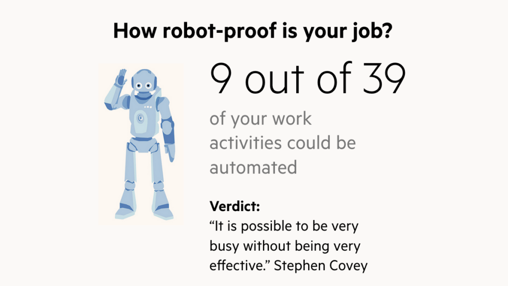 This is somewhat close to what I expected as I have very intentionally attempted to move myself into areas of my career focus that are difficult to mechanize. However, I think this actually underestimates (as is the tendency) the activities in my vocation which can be somewhat-easily automated. From my experience, about 15 out of the 39 tasks (as opposed to 9) in the linked page that I routinely undertake can be done by bots now or in the near future.