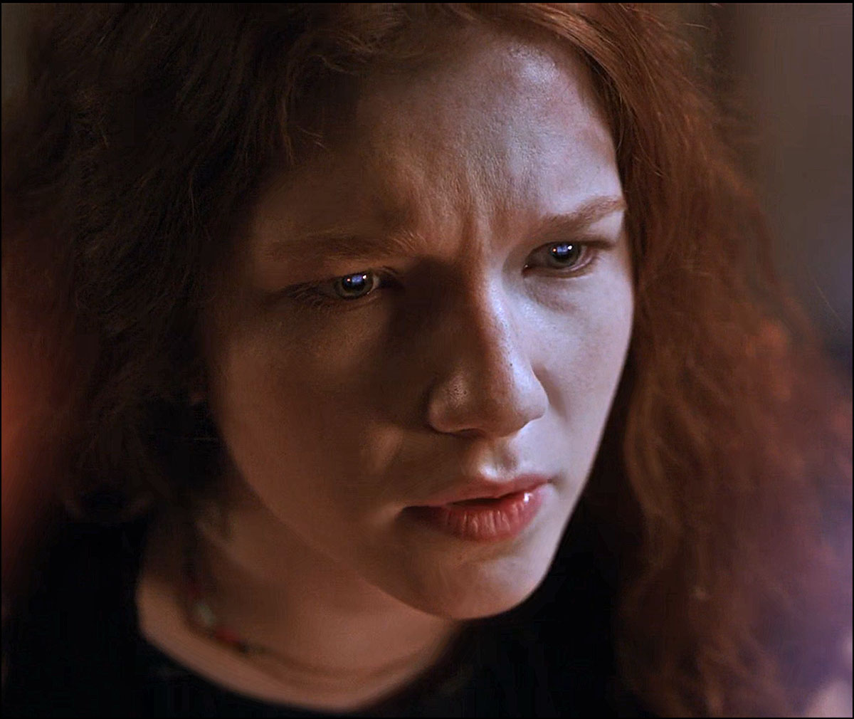 There’s a scene, though, where the daughter (played by Annalise Basso) is having trouble adjusting to her new environs with all its necessary tech. She doesn’t know how to use her new “Dex” which is some augmented reality surveillance device that everyone uses. She finds a friendly tech support person to help her with the device and is speaking to him to set up the Dex — just watching her face as she makes that simple connection over a voice chat with one of the few people who has been friendly to her in her new environs is a study in great acting. I watched that scene a few times and it just gets better each time.