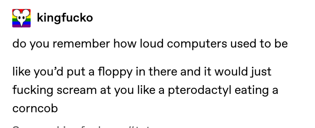 I remember. My brain still sometimes interprets non-noisy computers as “broken” as that’s what any computer from 1980-2000 or so would’ve been. Modems screeching, hard drives yammering, chattering and seeking, CD-ROMs winding up like a UH-1 Huey, floppy drives grinding and groaning — a working computer to me is a noisy one.