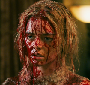 She’s already seen and done so much she’s not disgusted by it, or really bothered by anything anymore. She smacks her lips a few times and gives an almost-perceptible look saying, “Ok, whatever” and almost seems to be laughing at herself — presumably at the contrast of who she was a few hours before to now, from happy bride to mouth filled with blood in a burning house.