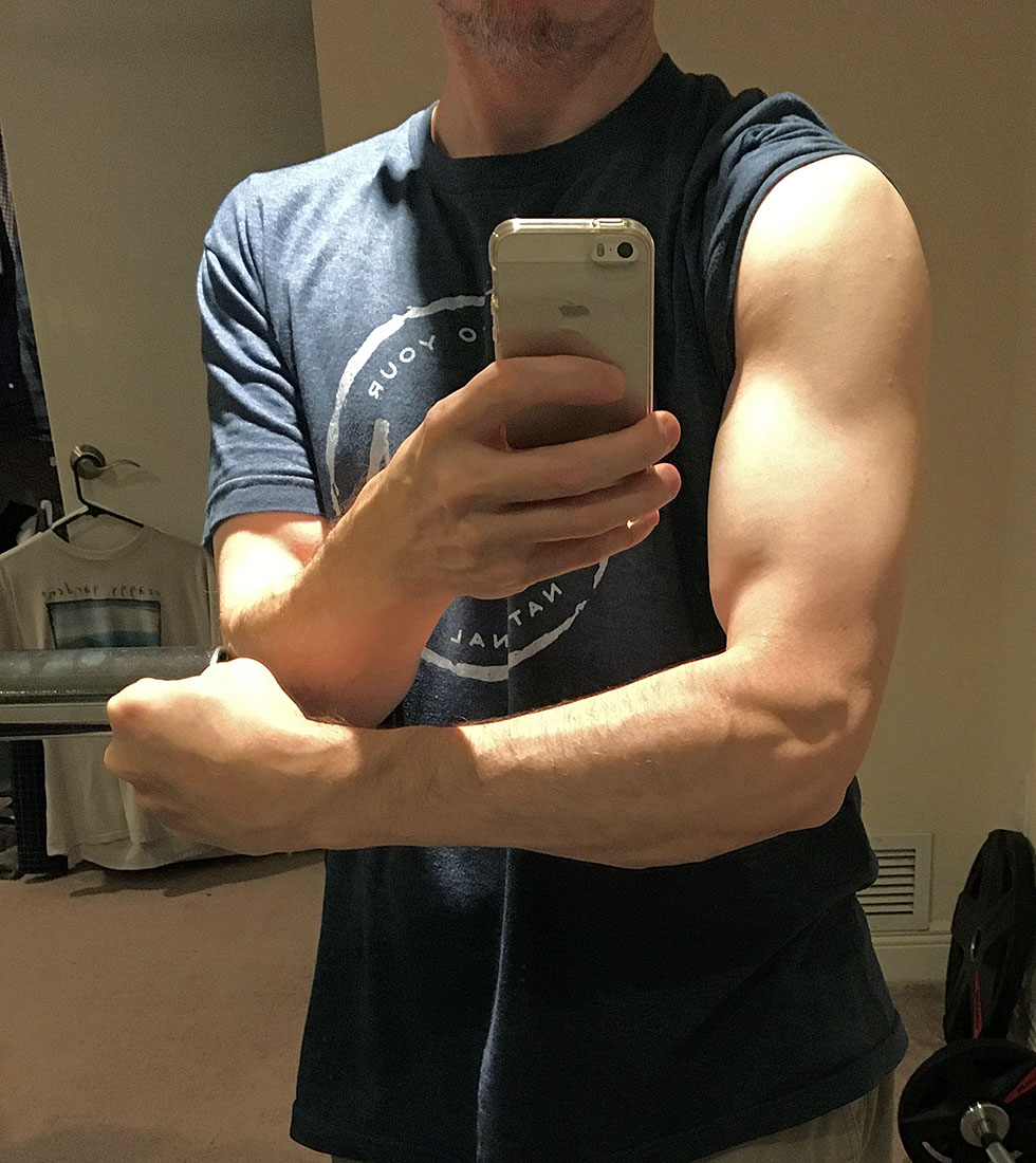Terrible lighting in that first one, but notice the greater size and definition there — and I’m not even flexing half as hard in the first one as in the second one because my tendons were sore. If I fully flexed as I was in the second one, I’d look quite a bit bigger.