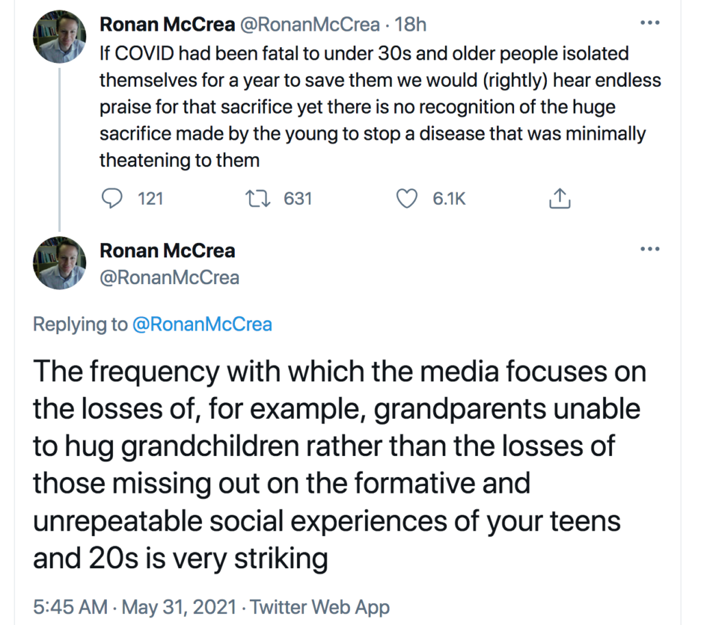 I was not all that social in high school, but I would’ve been absolutely devastated to miss those milestone events of my junior and senior year that I actually cared about. And even worse would’ve been not being able to spend time with my friends. You can’t get those experiences back and you can never repeat them. They are invaluable and now to many irrevocably lost. And when you’re young is exactly when those types of events matter so much more, and we spent the greater part of a year with kids isolated behind screens, all the while we frantically screeched that it was no big deal — like it was some minor inconvenience rather than social and psychological terrorism enacted on an almost-unthinkable scale.