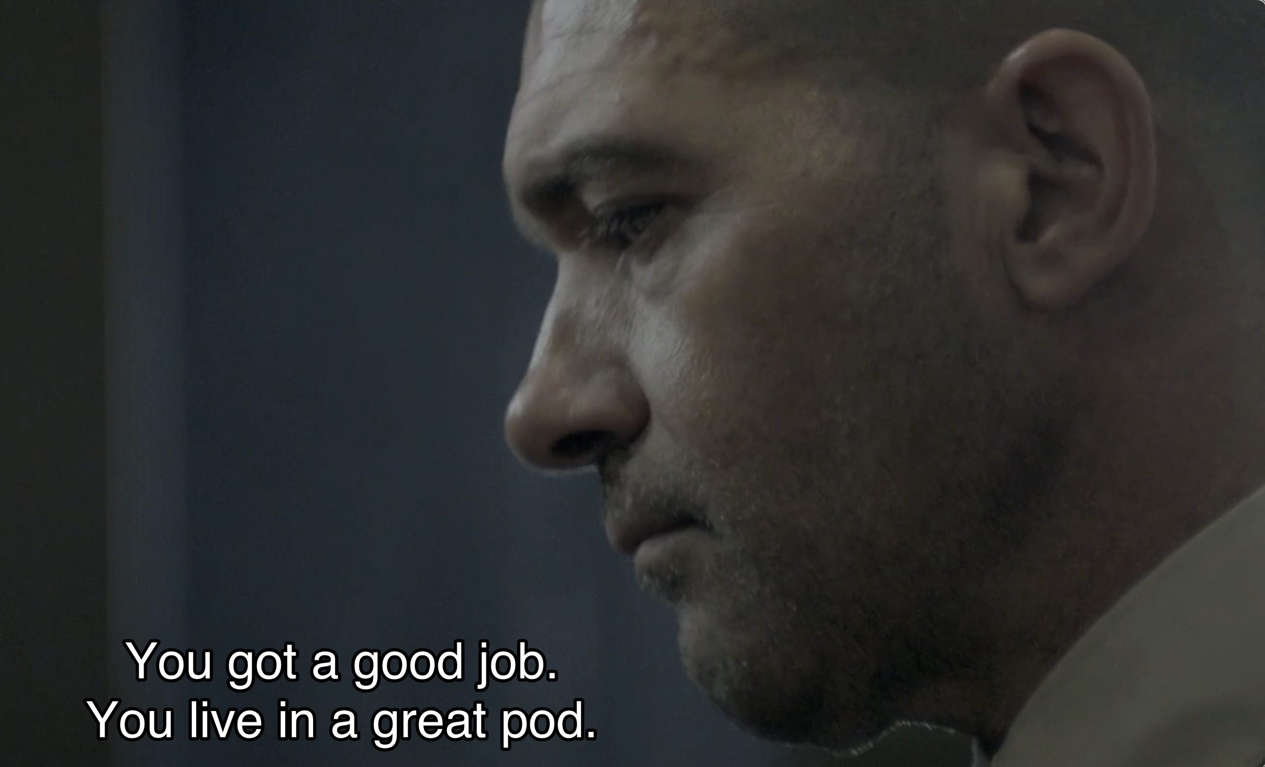 The “great pod” in this film is a shitty, tiny apartment with some tech where they eat food that looks like it all came from cans and was extruded from moldy peas. Which, you know, is how it’d really be. The “great pod” wasn’t a naรฏve line.