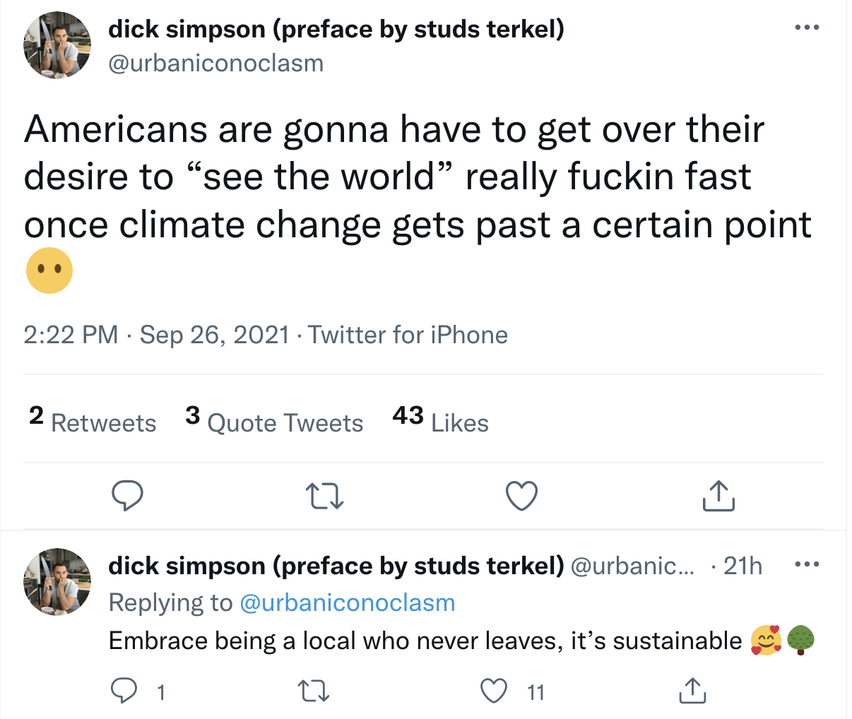 We should be expanding people’s ability to travel, not decreasing it, while making the technology better and cleaner. These doofuses of course don’t even really care about making the world better; they’d be advocating taking away things from people no matter what because it gives them a thrill.