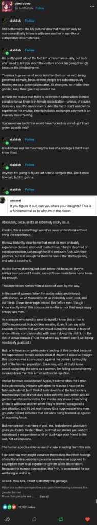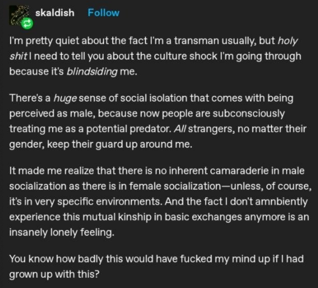 Yes, yes, women have it worse in some ways but at least they aren’t treated 24/7 as someone always on the verge of assaulting or harming anyone in the vicinity. Because men are treated that way and it’s psychologically very costly. And to women who say men “deserve it” because some men are in fact creepy and terrible: that logic doesn’t make any damn sense.