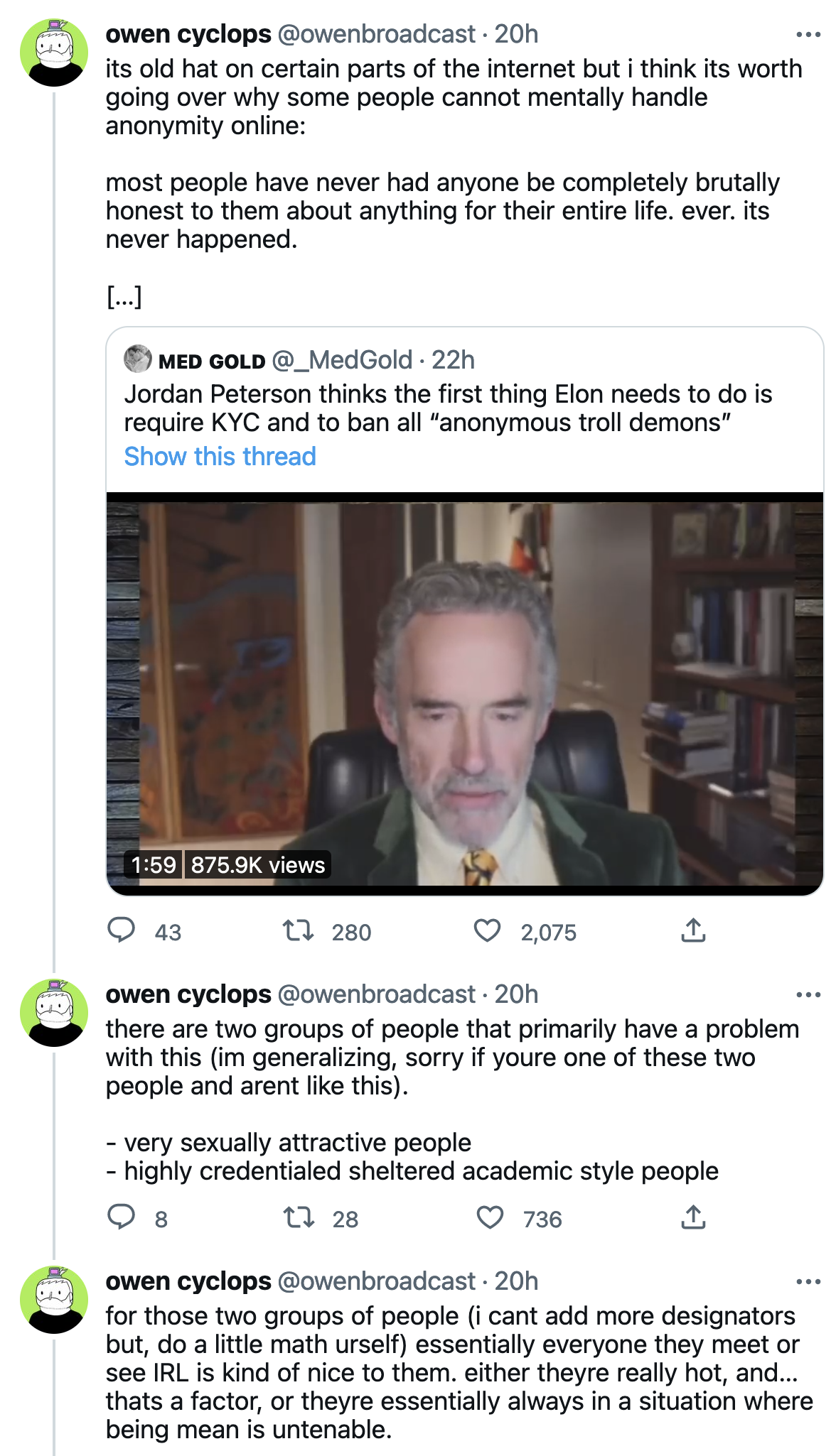 I’ve noticed before that the most attractive women on Twitter (with the exception of Aella and a few others) are the ones who have the most issues when people disagree with them. Many extremely attractive women have never had a person strongly disagree with them in their lives to any extent. The halo of conventional beauty does provide this, so it’s a real shock when someone doesn’t give a shit how they look and calls them an idiot. It’s not misogyny when someone disagrees, though — it’s just that they’ve never or rarely experienced it before.