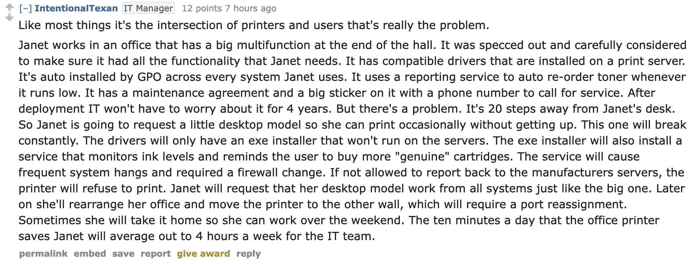 I’ve seen that play out numerous times. Americans are so lazy that they’ll refuse to walk 15 feet to get their documents on a real printer that works and instead demand a crappy office printer that nearly requires a full-time helpdesk person (especially the way users often abuse them).