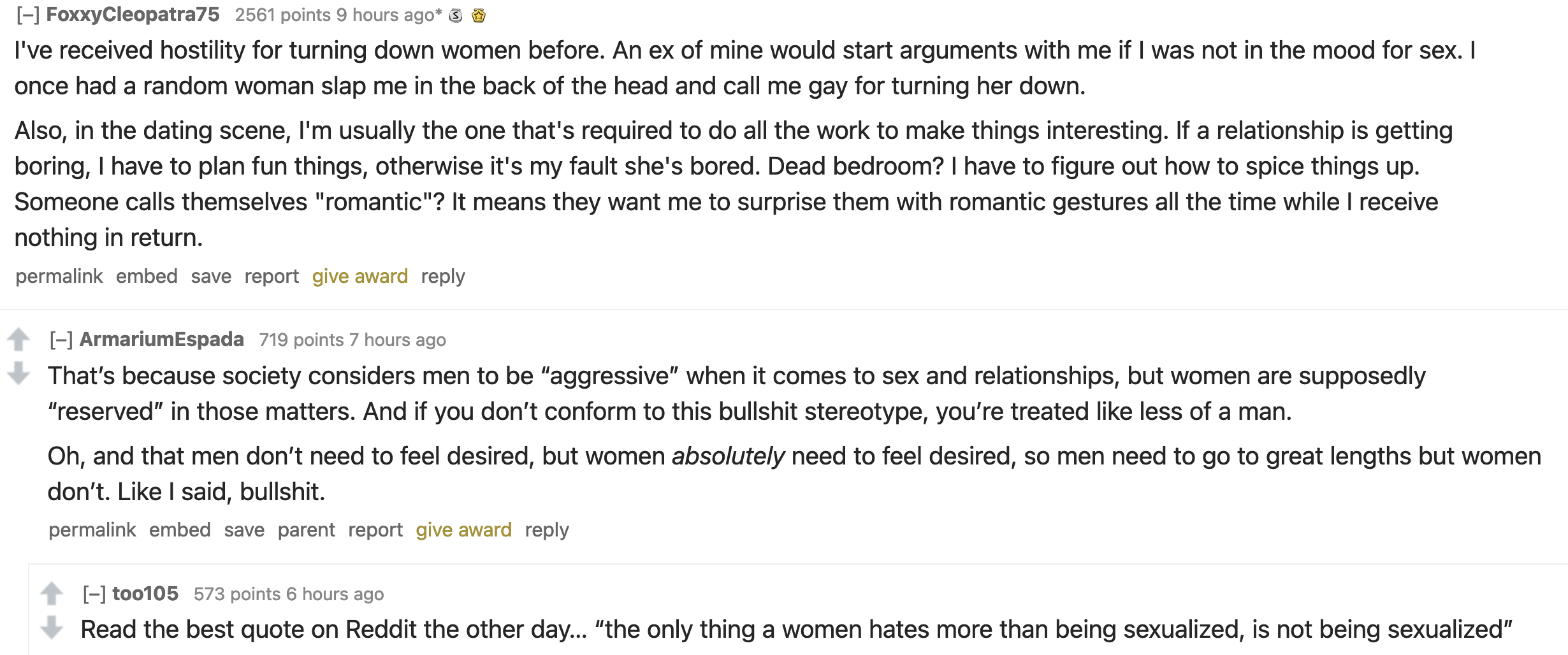 A lot of men dream of a world where they are sexually desired at all, ever. Big difference!