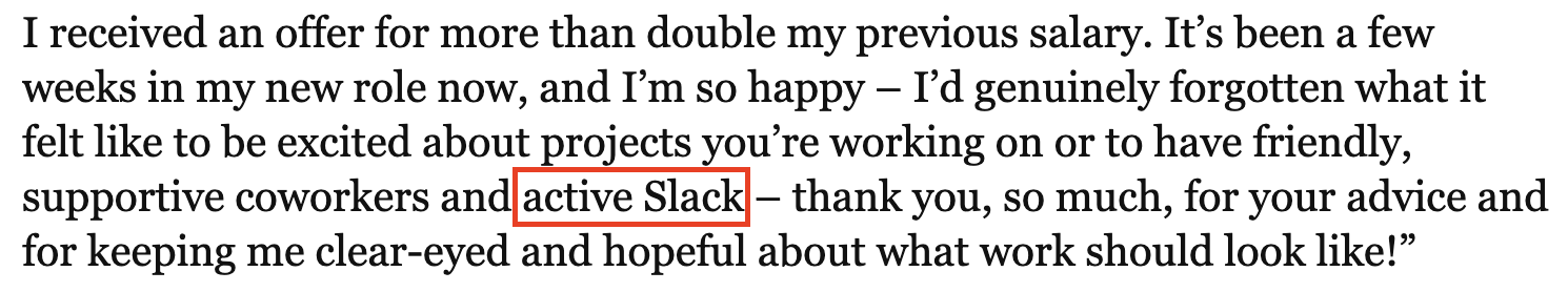 This is just a reminder of how really different people are. There are folks who really do want their Slack to be blowing up all the time, while I cannot imagine anything more hellish and productivity-destroying.