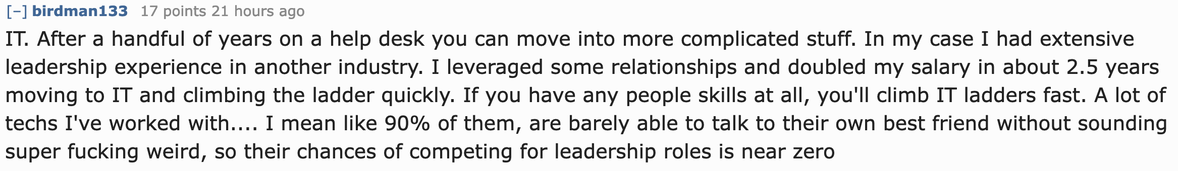 It also makes me able to schmooze with execs which means they think of me first when it comes time for promotion โ€” especially since I already have leadership skills (polite way of saying I am bossy โ€” have no trouble telling people what to do). But yeah, if youโ€™re in tech and have good people skills you are doing better than nearly everyone and your path is cleared by general competence.