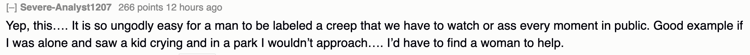 Meanwhile, the bad men donโt give a crap so those are the only ones women will have any interactions with. Women have accidentally but in a very real way created a terrible equilibrium where theyโve guaranteed they will only have negative interactions with men. Good work!