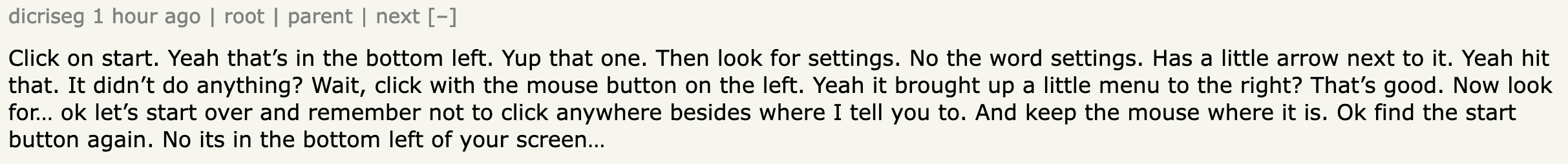 I think my record for telling someone how to find their Windows start menu on a single call is right around 10 times โ where they actually found it, anyway. More than a few never could. And this was the era when it actually said โStartโ on it as plain as could be. Apparently using a computer prevents many people from tasks like reading or having a functioning brain.