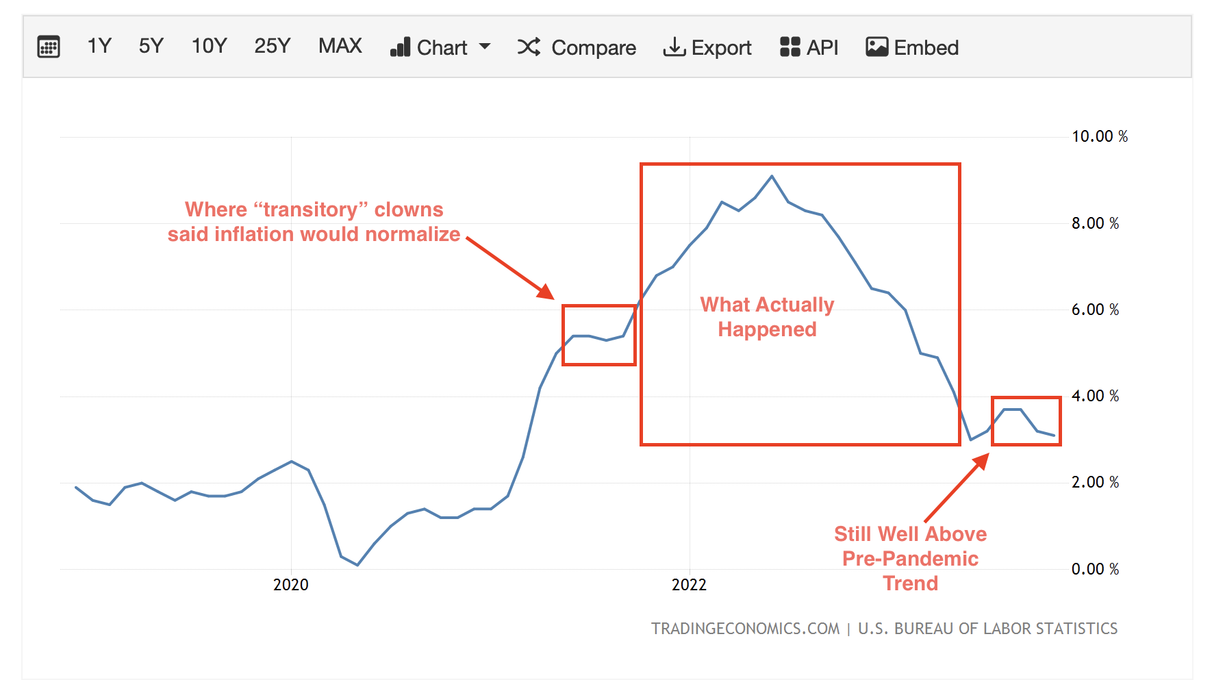 This sort of lying bothers me. Recall, the โtransitoryโ camp claimed that inflation would return to normal in 3-6 months. Iโve even made a handy graph below.