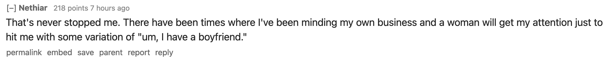 I’ve never understood that but I guess it’s about power? It used to happen to me fairly often, be minding my own business, doing nothing at all. Then, “I have a boyfriend.” Ok, great, who cares. Then I started responding with, “Good for you.” Then after that didn’t seem like enough, I started responding with, “So do I!” to really piss ’em off.