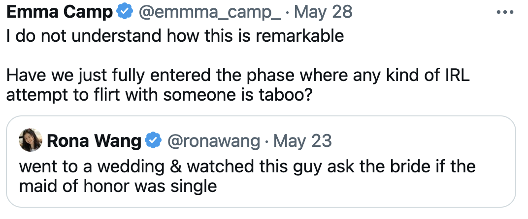 We have. Gen Z and younger millennials view any form of in-person flirting as completely taboo and verboten. Itโs such an oddball thing. They are so afraid of the world. Just terrified. Smartphones and social media are largely responsible. Haidt-haters can put that in their fucking useless Excel spreadsheets and smoke it.
