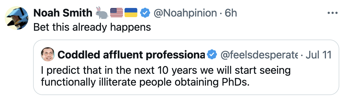 PhDumbass July 13, 2024, 9:01 PM Chill Uncategorized Oh, this definitely already happens. Have met a few people with PhDs in education and human resources who could clearly barely read and could not understand complex sentences in the least.