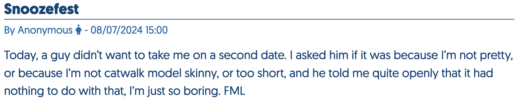 So odd, though. Those prudes don’t care about any of the other just-as-real and just-as-valid dealbreakers you have. For some reason those are not singled out for you being terrible and creepy. Despite the fact that I personally also wouldn’t accept someone with tattoos, or who tormented waitresses or serving staff. So who is really obsessed with sex here? To me it looks like it’s not men at all.