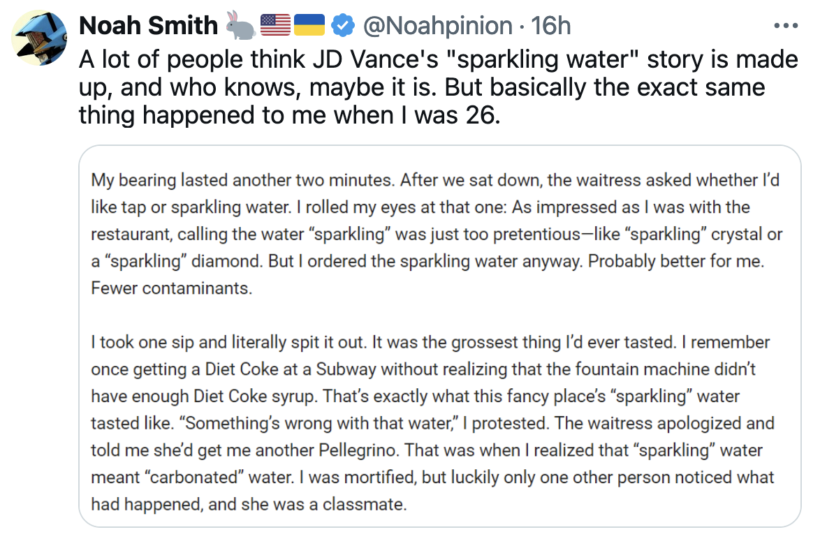 Some waitress when I was in the army gave me sparkling water and I had no fucking clue what it was, either. It also tasted like garbage and I could not drink it. I believe Vanceโ€™s story; when you grow up in hick areas with no culture, you donโ€™t see much and only know what you read about.
