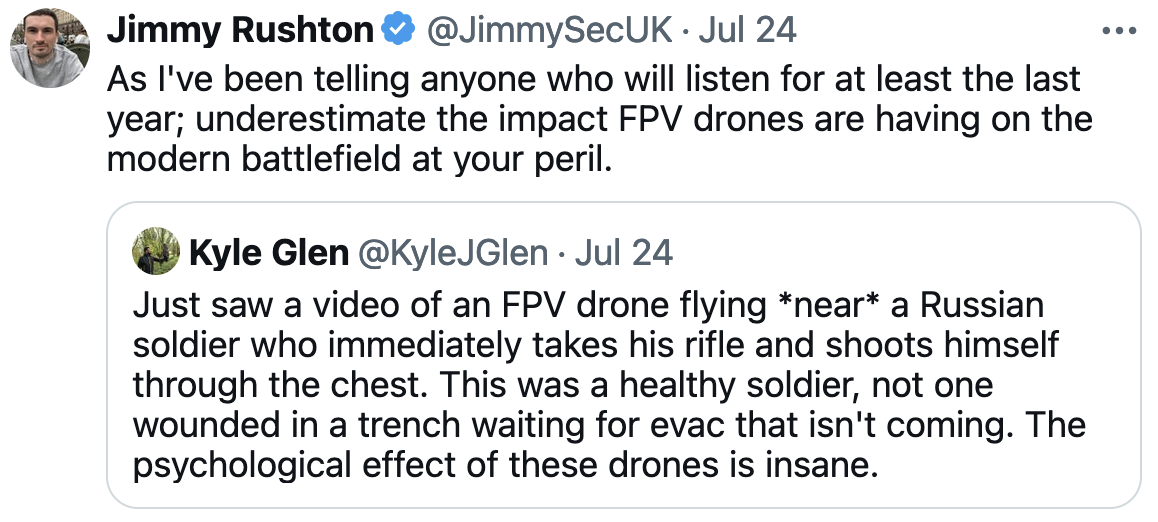 That said, it is worth watching to see how incredibly terrible the Russian tactics are. What was even the purpose of that? A poorly-organized armored assault in broad daylight across an open, flat area with no artillery support, no CAS, and just nothing that any combined arms units should ever, ever do?