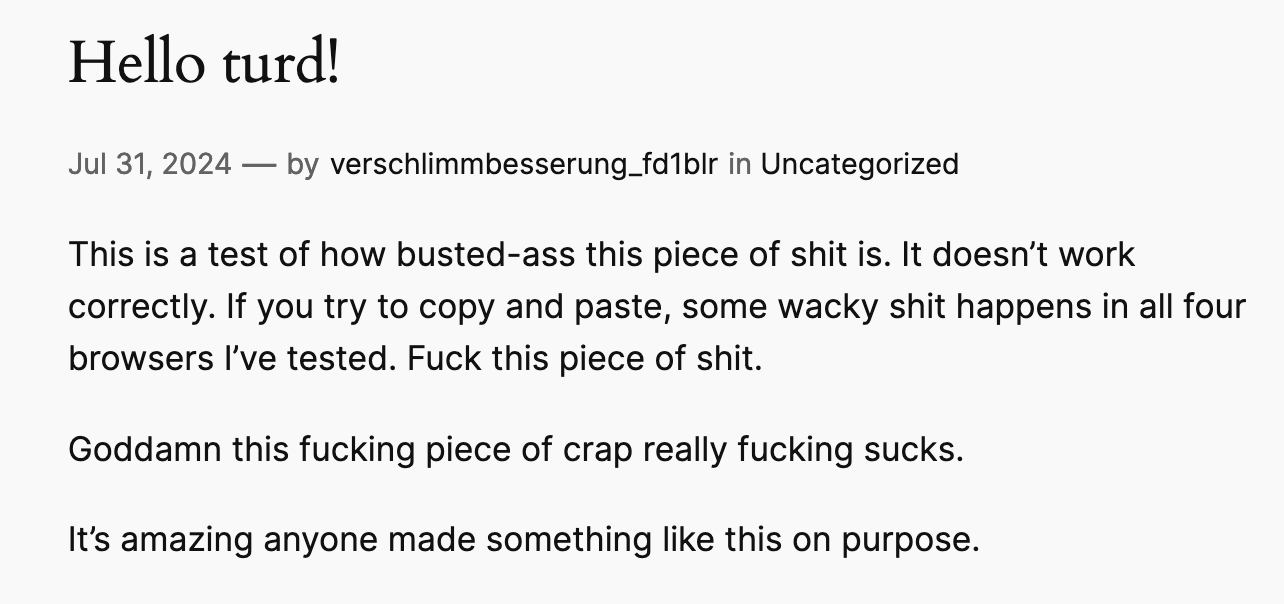 Wacky Happenings July 31, 2024, 4:52 PMAugust 6, 2024, 4:40 PM Chill Image, Regular-ass Post Hereโs my full thoughts on the block editor in WordPress: