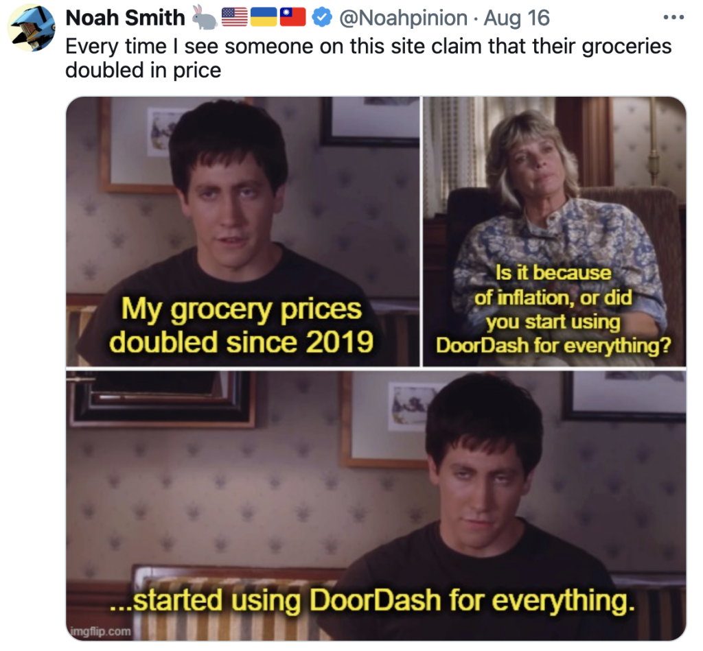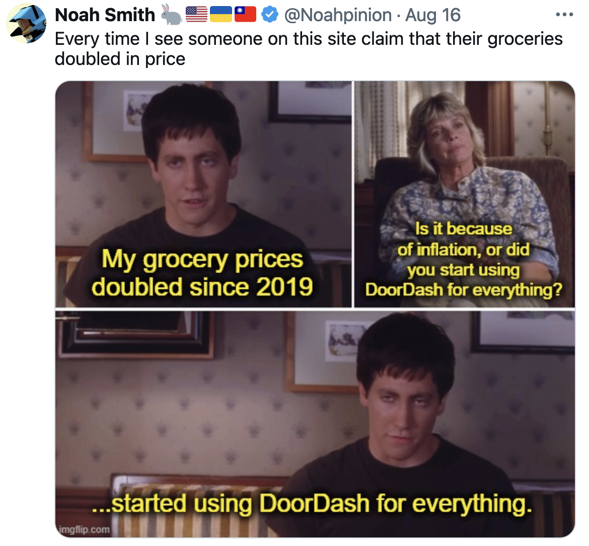 We’ve never used DoorDash or anything like that and our grocery costs have roughly doubled1 since 2019. And we buy about the same things. Why do econs try so very hard to con us about this?