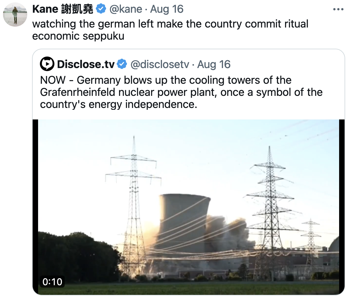 Nuclear Destruction August 17, 2024, 7:06 PMAugust 17, 2024, 7:11 PM Chill America Fuck Yeah Itโs going to end up being a bipolar world (America, China) at least partly because other countries insist on just voluntarily fucking themselves over. What Germany is doing is pure goddamn insanity.