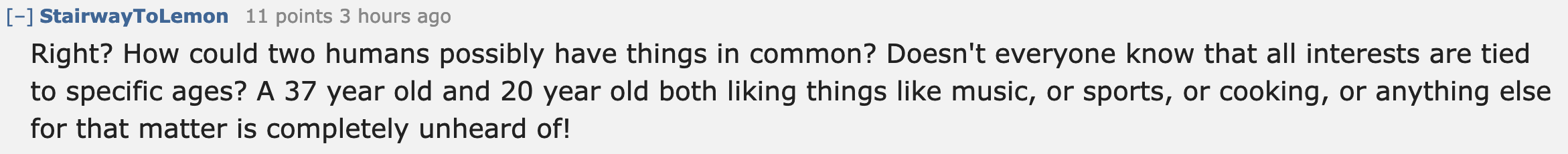 I think age gap romantic relationships are beneficial to the vast majority of people1, but even more than that I think age gap friendships are far more beneficial than the romantic variety. It saddens me to see so many people say itโ€™s โ€œcreepyโ€ that, for example, someone 38 is friends is with someone 21. That seems to be the majority view, at least in the US. Other countries donโ€™t insist on such strict and dogmatically-enforced age segregation โ€” and in fact find it odd how bizarrely age-segregated the US is when they visit here.