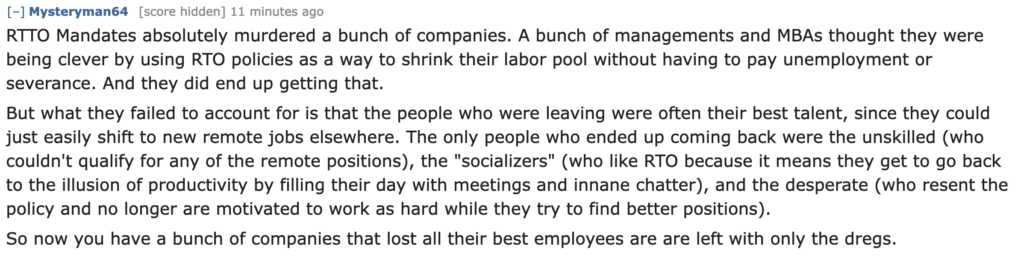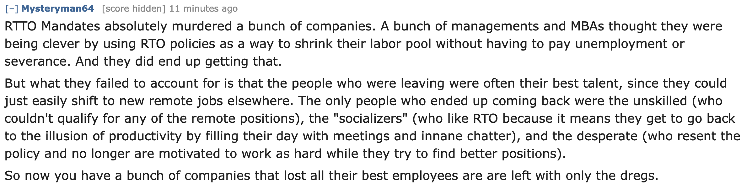 RTO means terrible decision-making in general. So those companies would be doubly unpleasant to work for. Not only would they have bad management (as evinced by RTO), but the people working there will be shit because theyโre the ones too incompetent or uncompetitive in the job marketplace to be hired anywhere without RTO policies.