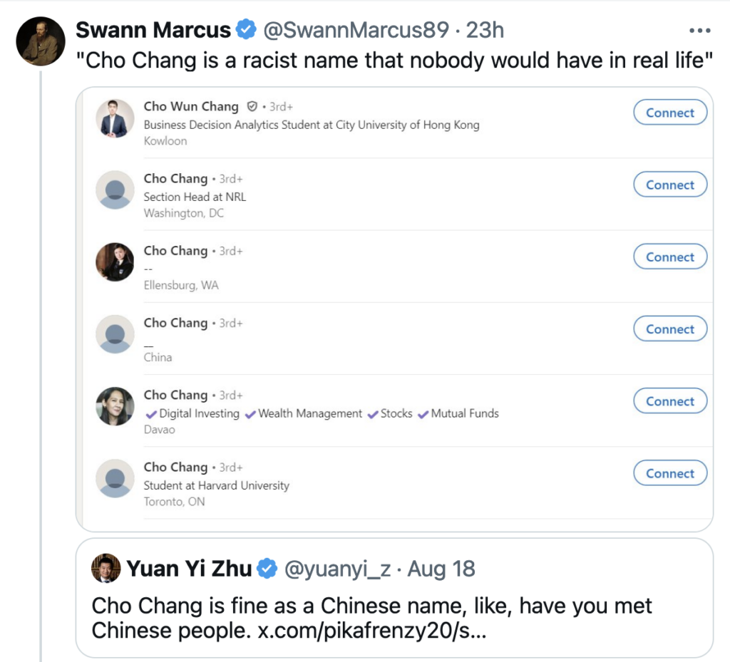 I was laughing at the Rowling-haters when that nonsense came up a few years ago. โ€œCho Changโ€ is a fairly common Chinese name. I met at least one, maybe two, people named that when I lived there. Canโ€™t remember for sure now.