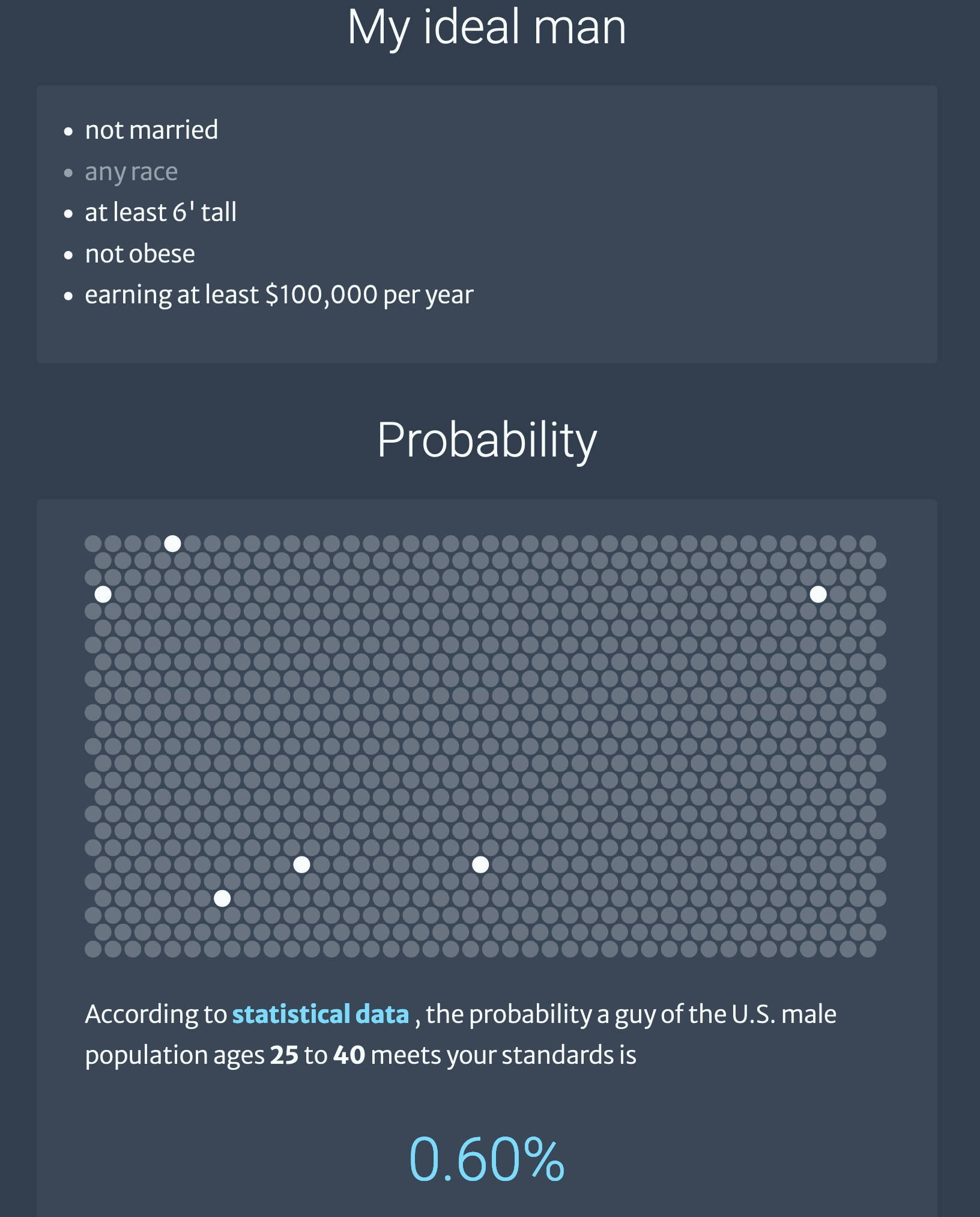 Social media has led all too many women to believe in the fact they have a shot at obtaining that 0.6% of the male population. Good luck with that. When you have 80% of women competing for 0.6% of the available men, the dating market becomes what you see now.