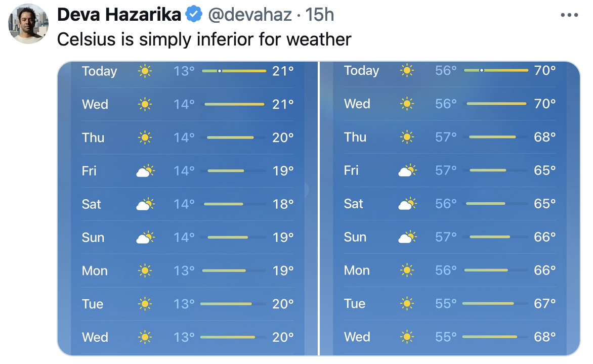 The whole-number discrete jumps are too large; does not have enough granularity without using decimals and sounding like a robot. I in fact do care whether itโs 69 or 71 outside but in Celsius thatโs all the same thing: 21 degrees! Fuck that noise.