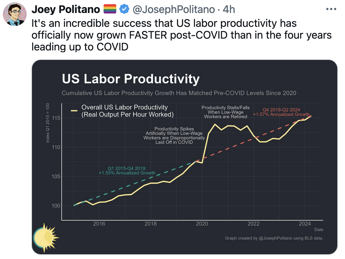 That was mostly due to WFH and will not look so rosy as RTO becomes more entrenched. Most of the gain is due to people being more productive working from home, both in absolute terms and because they work longer hours. MBA types don’t care about productivity, though; they are concerned with power.