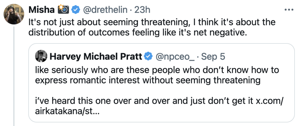 If youโre a man, the average case of even a good outcome is that you end up in a mediocre relationship with a narcissist and the average case of a bad outcome is that you get rudely rejected โ with the outside but very real chance that you get ostracized, fired or even jailed if a woman wants to go nuclear on you for the horrible crime of being awkward or unattractive.