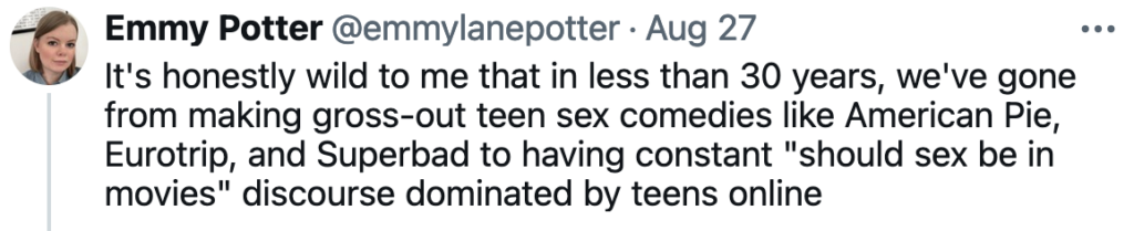 Pie Tasting September 6, 2024, 4:36 PMSeptember 6, 2024, 4:37 PM Chill Sex And various goofuses were arguing with me a while ago, claiming that society in toto was not getting vastly more prudish. Totally wrong.