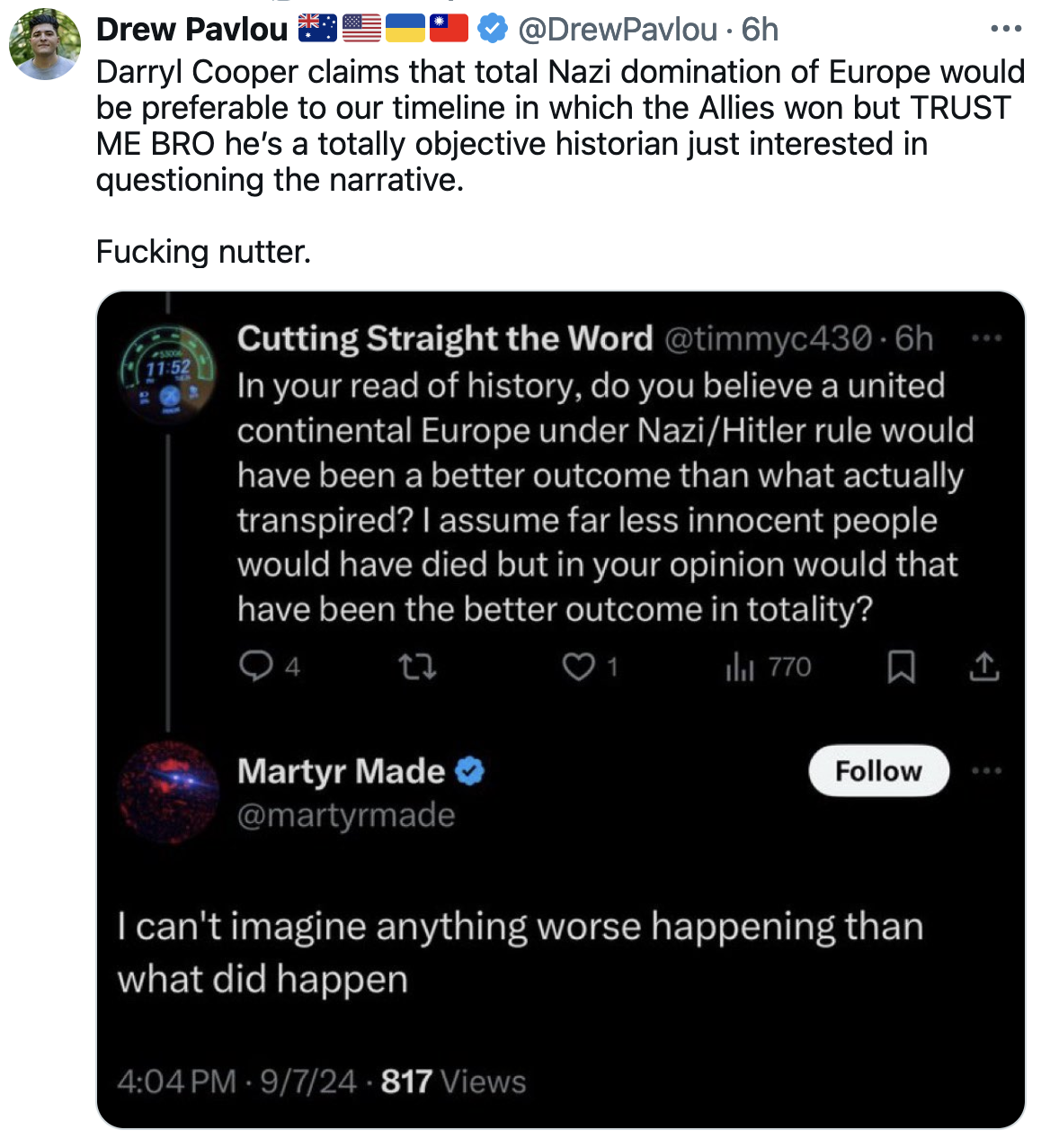 It’s been wild watching the left and the right creep back towards supporting Nazism due to backing Russia against Ukraine. It’s really fucking odd, I know, but the logic (as hinted at in the post below) seem to be this: