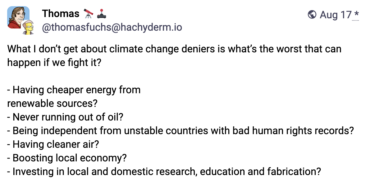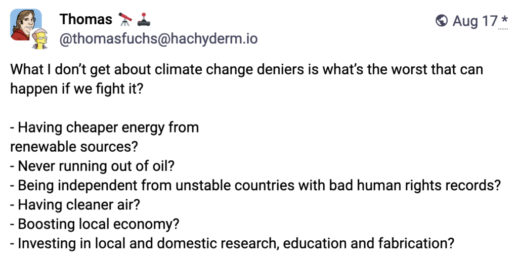 Disbelieving in climate change is a religion. And in a belief system like that, what would actually occur and the evidence just does not matter. As with the Covidians, the religious feeling is what is important, is what is driving the anti-reality behavior. With that sort of nonsense people are glad to hurt themselves to prove their devotion.
