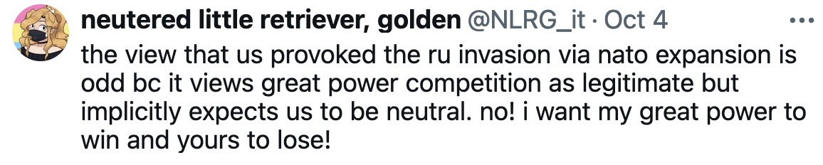 I was thinking about that other day, how the โ€œUkraine should just roll over and be genocidedโ€ people clearly believe in great power competition, they just want one side to lose. I will never understand Putin worshippers, especially those who were born in and are citizens of any Western country. Like, couldnโ€™t you find someone less odious to worship? Less genocidal? Less comically evil?