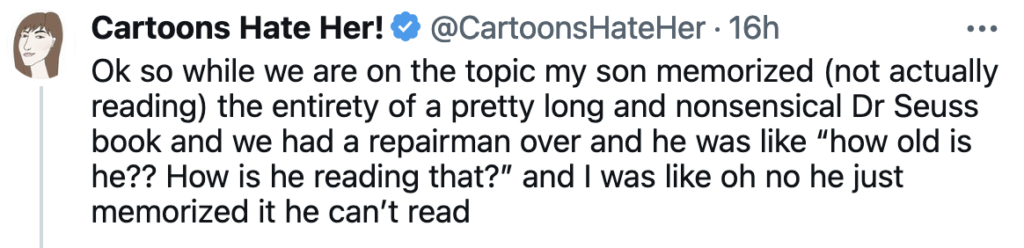I was accused of memorizing books when I could definitely read very young, between 3-4 years old. I remember being angry about that. (One of my earliest memories is being incensed at adults underestimating me.) I could read fine. To prove I could actually read, I picked up one of my grandfather’s electrical engineering books and started reading it aloud. There were some words I didn’t yet know, but I had no problem with most of it.