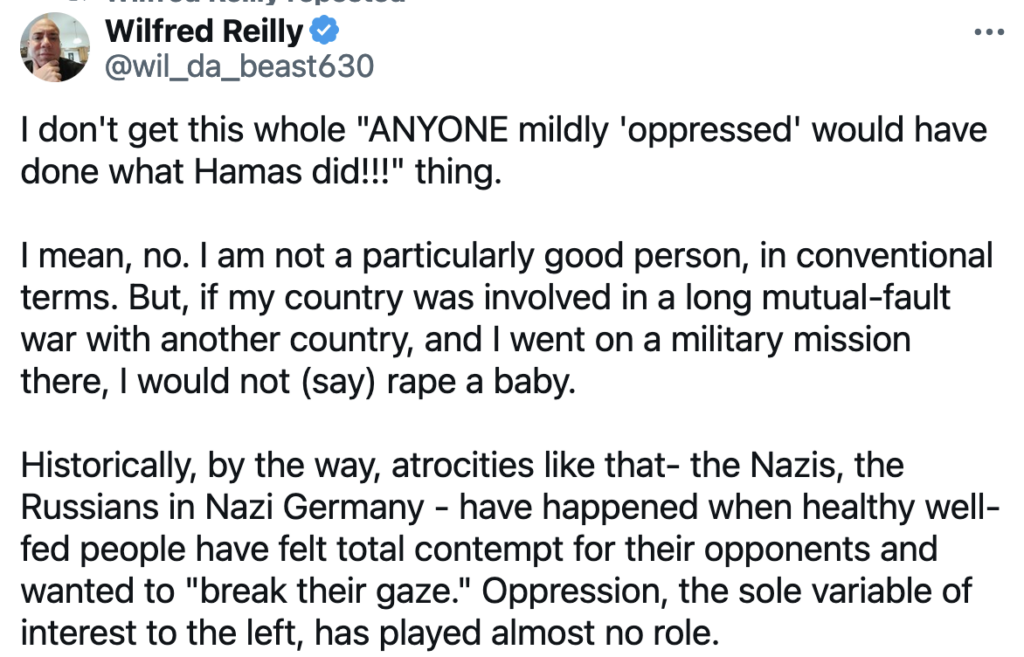 Exactly. If some entity invaded the US, Iโd to the best of my abilities repel and if needed kill every damn one of them I could get in my gunsight. But I wouldnโt torture or rape them. And I certainly wouldnโt be kidnapping civilian women at music festivals, mutilating and violating their corpses and then parading them through the streets in celebration.