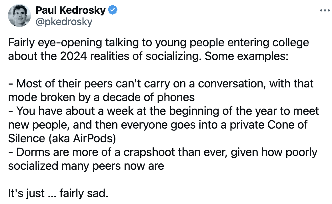 It’s shocking to realize that those below the age of ~32 just 100% do not know how to talk to anyone in person — not each other, not teachers, not older people. No one. It’s no wonder they have such difficulty with dating and are so prudish. The world of other humans right there in front of you must be absolutely terrifying to them. We have done fucked up, but I am not sure what to do about it (banning smartphones would be a good start).