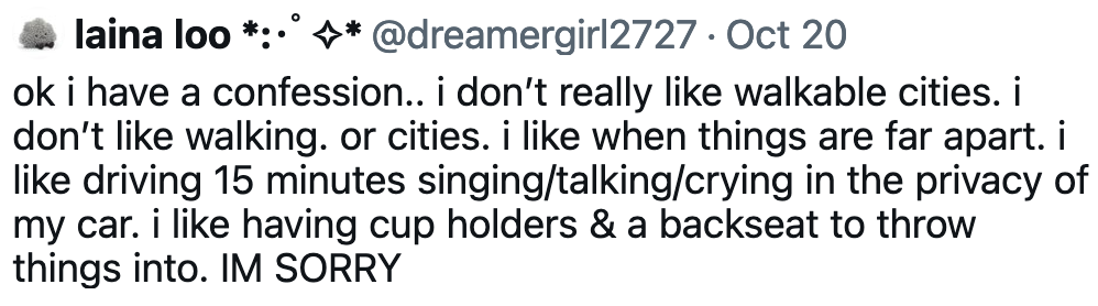 I do too, mostly. I donโ€™t really like cities much and donโ€™t enjoy walking in them. Even โ€œdenseโ€ ones. Iโ€™m glad that the option exists where it does, but itโ€™s not for me. If I had more of a choice, Iโ€™d live 20-30 minutes away from a reasonably-sized city on 5-20 acres of land.