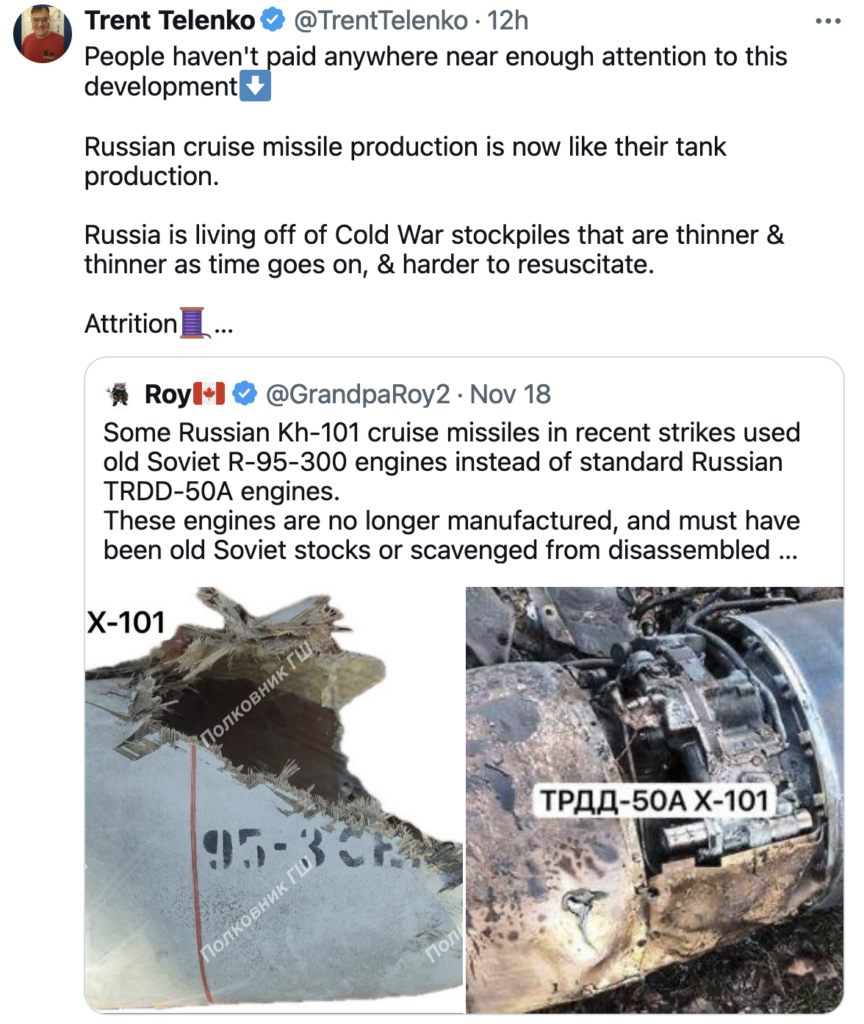 Eventually, Russia is going to run out of stuff. They are able to produce war materiel at about 1/10 the rate itโs getting spent on the battlefield. However, Russia has a fucking lot of stockpiled stuff.