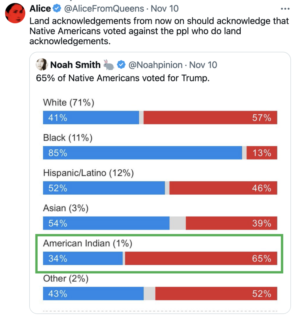 That was always performatively aimed at other white liberals. It was never about Native Americans or anyone else.