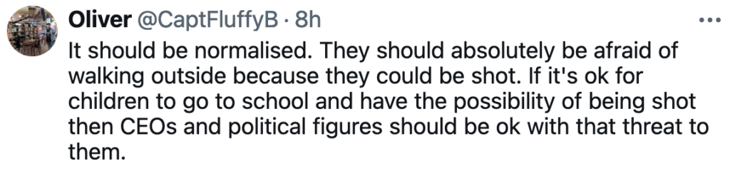 If the corporate MBA types and their follow-on bootlickers, brown-nosers and sycophants hadn’t made life so very terrible for so many Americans, no one would be celebrating the death of that dipshit. But there are a few thousand more CEOs and execs who need to be — and deserve to be — put up against the wall.