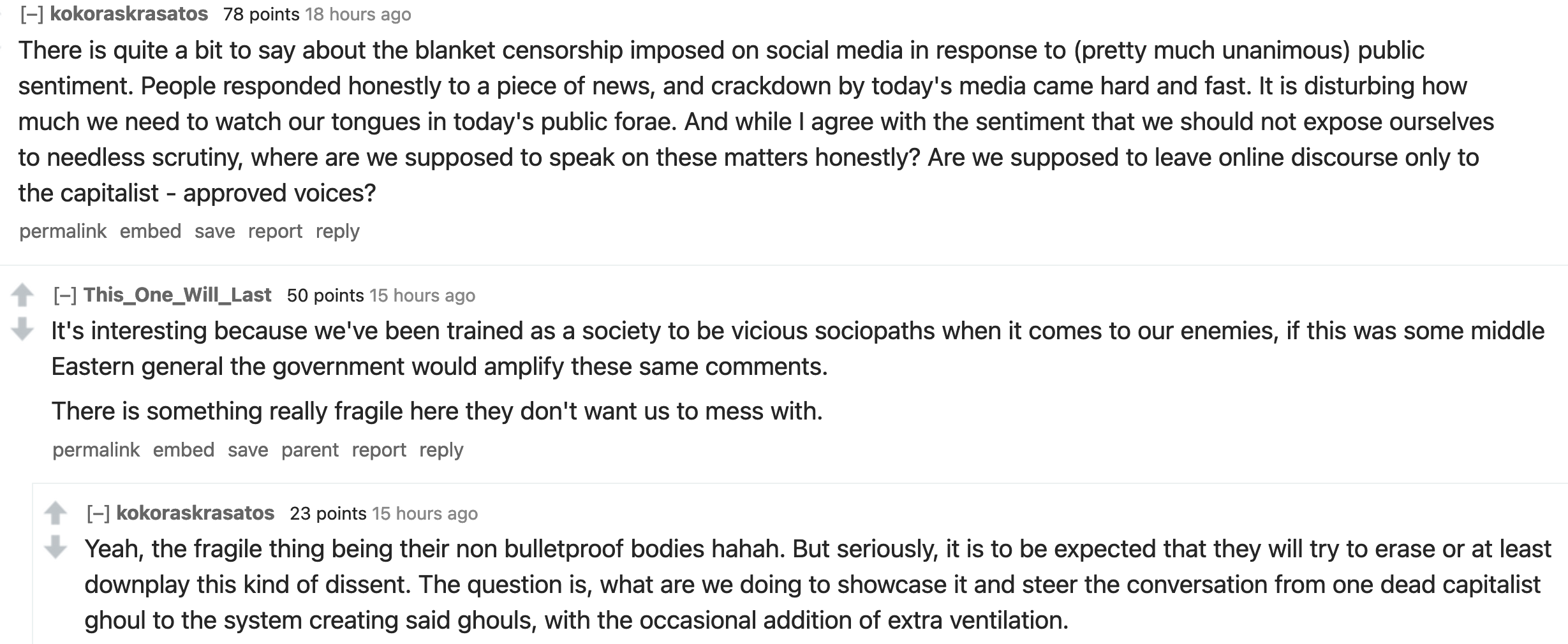 As the series of below comments notes, on corporate social media the nearly-unanimous joy about the UHC sociopathโs assassination is being very heavily censored and suppressed while capitalist and UHC-approved views are being promoted.
