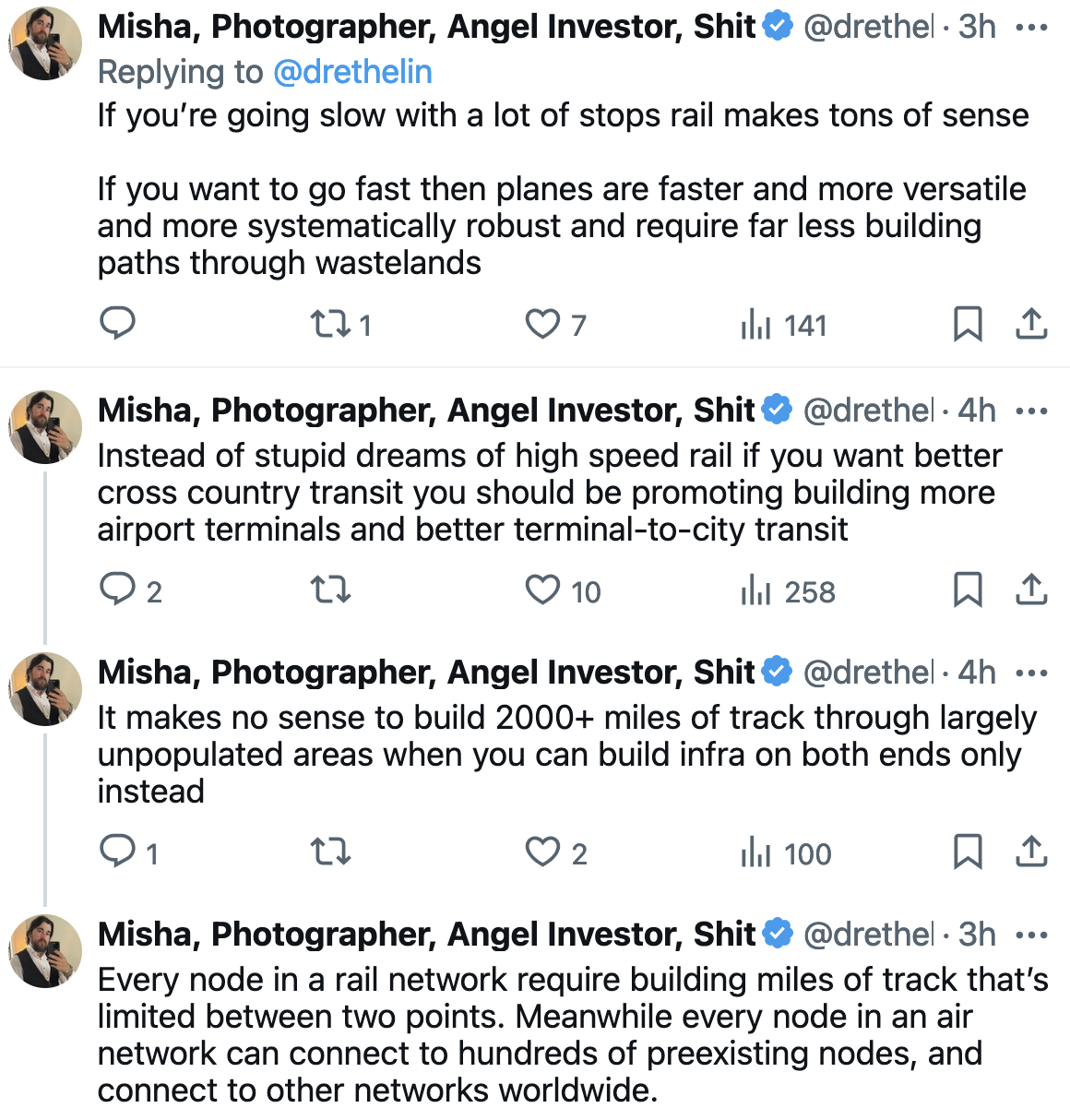 Trains are a romantic thing for a lot of the left. But in much of the US, long-distance rail makes no sense. Air travel is cheaper and far, far more flexible. Building all that rail is fantastically expensive and then you have to maintain it (also expensive). And even after all that, it only goes 1-2 places.