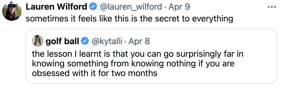 This is true. And this is exactly what I do. Itโs important to note that you cannot become an actual (what I would consider an) expert in two months. But in that time you can learn more about a topic and be more competent at it than 99.9999% of regular people, and about 65% of so-called credentialed experts. Depending, of course, on the topic.